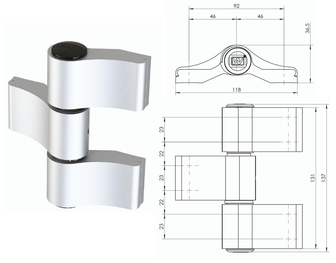 Zawias nawierzchniowy WALA WX, 3-skrzydłowy, 92mm, surowy. Personalizacja powierzchni, płynne otwieranie.